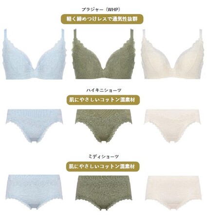 突然暑くなったり、汗が止まらなかったり……。日々変わる、大人の女性の快適さに対応するシリーズです。自然な谷間をメイクするコンパクトめの3/4カップで、ナチュラルなシルエットに整えるブラジャー(WHP)は、通気性に優れたエンジェルさらスルーカップ(R)を採用。カップと背部の肌側に、肌ざわりが良く、吸放湿性のある綿混素材を使用しています。