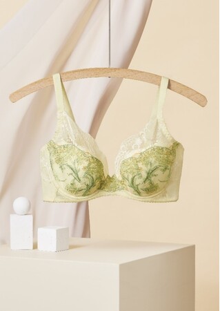 レースは、大輪のクレマチスの花がモチーフ。光沢糸とコード紙使いに、豊かな表情と高級感があふれます。ブラジャーの背部やコサージュ、ロングガードルには花柄のジャカード生地を使用。落ち着いた中にも、華やかなトータルコーディネートをお楽しみいただけます。