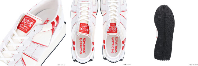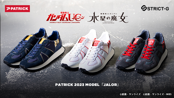 本コラボ商品は、「PATRICK」の新作モデル「JALOR(ジャロル)」を採用。レトロな雰囲気を醸し出したランニングシューズで、アウトソールは2004年SSシーズンに登場した「SYDNEY」のソールと、80年代のスカッシュシューズのソールデザインをミックスし、グリップ力が高く、ボリュームを持たせクッション性に優れています。アッパーはランダムな陰影が特徴で強度のあるナイロン素材を採用されたモデルです。『機動戦士ガンダムUC』よりユニコーンガンダムモデル、バンシィ・ノルンモデルの2種、『機動戦士ガンダム 水星の魔女』よりアスティカシア高等専門学園モデル1種を展開致します。