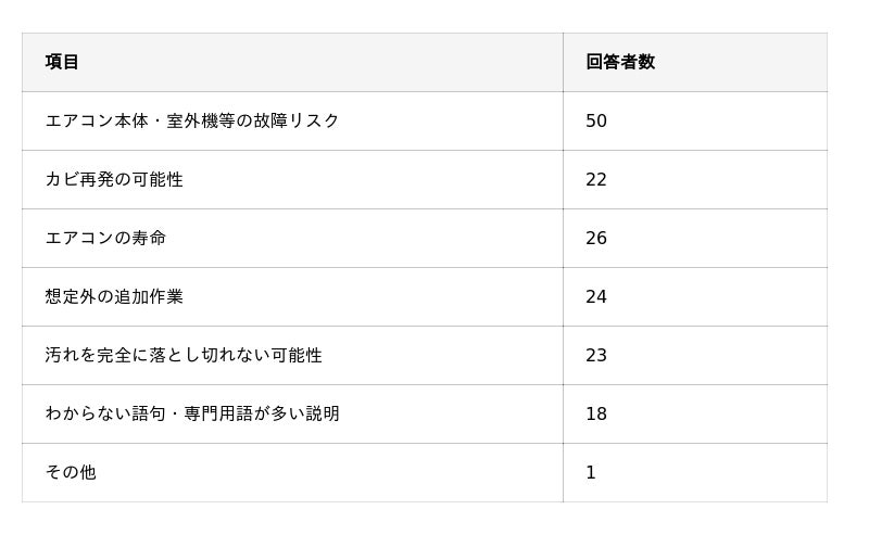 エアコンクリーニングで不安を感じた説明内容はどれに近いですか?(複数選択可能)