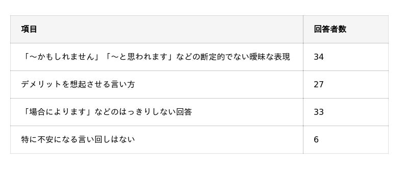 - 不安感を強める説明内容としては「断定的でない曖昧な表現」「はっきりしない回答」が多く挙げられている。