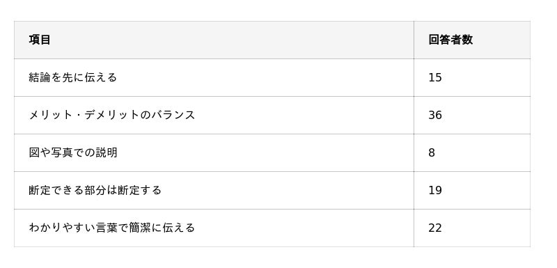 - 不安を感じにくい説明方法としては「メリット・デメリットのバランス」「わかりやすい言葉で簡潔に伝える」。