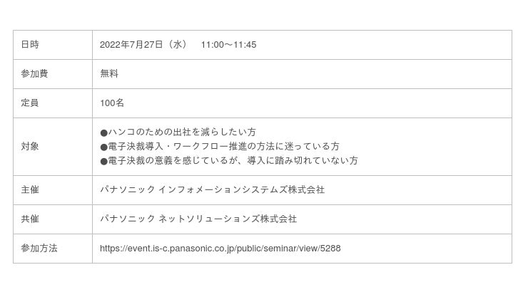 パナソニック インフォメーションシステムズ株式会社は、2022年7月27日(水)に「大学におけるワークフロー推進の秘訣」「費用対効果の見極め方」にフォーカスしたオンラインセミナーを開催します。