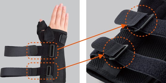 ▲母指・手関節部を包み込むシーネホルダーと各種ストラップにより手の形状や患部の状態に合わせてフィット感の調整が可能です。