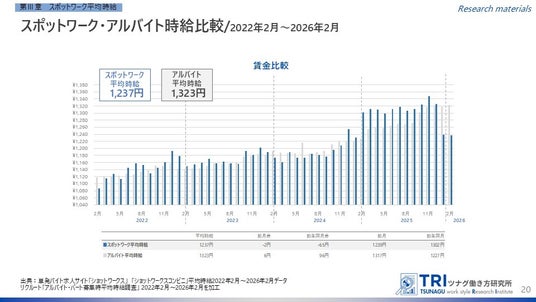 2026年2月度のスポットワーク平均時給は1,237円で、前月差-2円、前年同月差-65円となりました。通常のアルバイト平均時給は1,323円で(※リクルート発表「アルバイト・パート募集時平均時給調査」)、スポットワーク平均時給との比較では、通常アルバイトが86円高いという結果になっています。