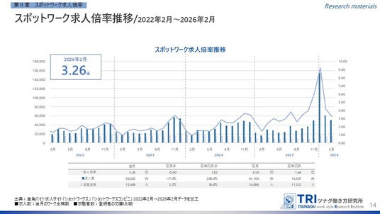 2026年2月度のスポットワーク求人倍率は3.26倍となりました。1月・2月にスポットワークの求人数が落ち着くのは例年通りの結果ですが、求人数は前月比17.4%減となり、求人の需要がピークとなる12月と比べて5.99ポイントも下落しました。一方、前年同月からは1.82ポイント上昇しています。