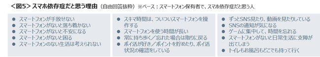 自身がスマホ依存症だと思う理由を自由回答で聴取した。スマートフォンが「手放せない」「ないと落ち着かない」「ないと不安になる」「ないと困る」「ない生活は考えられない」という声が多く、ちょっとしたスキマ時間にもスマートフォンを操作する習慣が身についている様子である。<図5>