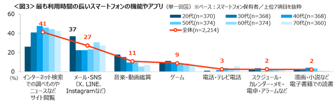 最も利用時間の長い機能やアプリでは、「インターネット検索での調べものやニュースなどのサイト閲覧」が41%、「メール・SNS」が27%、「音楽・動画鑑賞」11%、「ゲーム」が9%であった。「インターネット検索での調べものやニュースなどのサイト閲覧」は40代以上で多い。20代のみ、ネット検索よりも「メール・SNS」の利用時間が長いと回答した人が37%と多い。<図3>