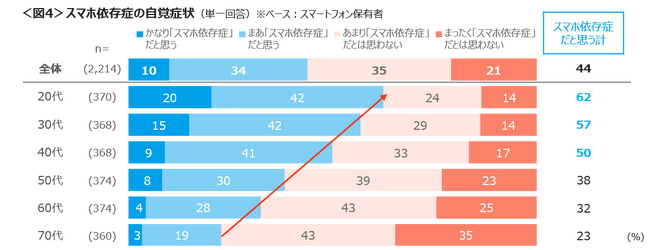 スマホ依存症の自覚を確認したところ、「かなりスマホ依存症だと思う」は10%、「まあスマホ依存症だと思う」はは34%、合わせて44%はスマホ依存症と自覚していた。20~30代は依存症と思う人が多く、40代は依存症と思う/思わないが拮抗、50~70代は逆に依存症と思わない人が多くなる。<図4>