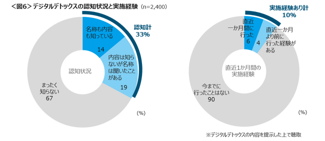 デジタルデトックスの「名称も内容も知っている」は14%、「内容はわからないが名称は聞いたことがある」が19%、合わせて33%の認知率であった。デジタルデトックスの内容を提示した上で聴取したデジタルデトックスの実施経験者は1割程度にとどまった。<図6>