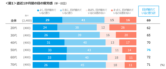 直近1か月間に「よく、目が疲れていると思う」は29%、「たまに、目が疲れていると思う」と合わて69%の人は目が疲れていると実感していた。老眼が進行してといると思われる50代では目への疲労感が76%と高い。<図1>