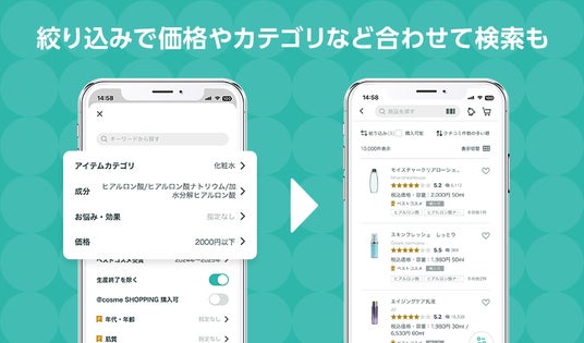 本機能により、生活者は「レチノール」や「アゼライン酸」といった話題の成分を含む商品や、特定の成分が入っていない商品を検索し、従来のクチコミランキングをはじめとした検索方法だけでは出会えなかった商品と出会うことが可能となります。
