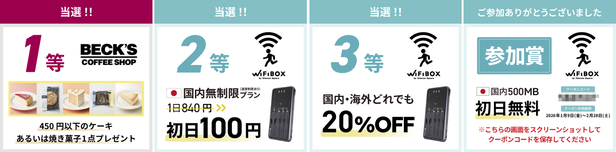 ・2等、3等、参加賞のWiFiBOX各種クーポンは、ベックスコーヒーショップに設置されているWiFiBOX以外でもご利用いただけます。また、1月9日(金)~2月28日(土)までにご予約いただいた分が、割引適用となります。