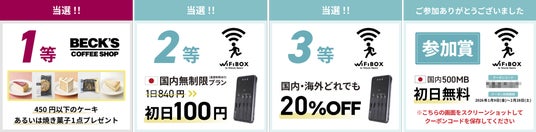 参加賞 WiFiBOX日本国内 500MBプラン初日無料クーポン:1等から3等に当選されなかった方