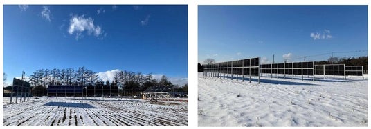 写真右:垂直式太陽光発電設備イメージ(2023年12月、自然電力が酪農学園大学敷地内に設置したもの)