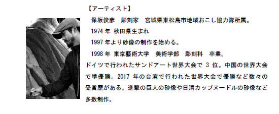 サンドアートは、直江津の海岸で採取した砂を 固めながら海の生きものを造形したもので、昨年に引き続き砂像彫刻家である保坂俊彦氏に創作いただきます。サンドアートは、「うみがたり」からインスピレーションを受けて創作いただく完全オリジナル作品で、360度どこから見てもお楽しみいただけます。 サンドアートは、やがて普通の砂に戻るというその儚さが、生きものの持つ美しさをいっそう引き立てます。