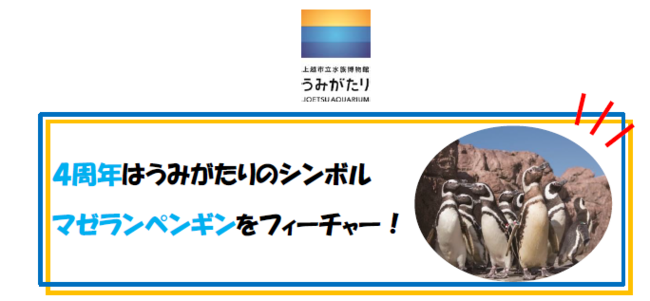 上越市立水族博物館 『うみがたり』(新潟県上越市五智2-15-15)は多くのお客さまや市民の皆さまに支えられ、令和4年6月26日に開館4周年を迎えます。日頃「うみがたり」をご愛顧くださる皆さまに感謝の気持ちを込めて、6月25日(土)からマゼランペンギンの魅力を詰め込んだ『うみがたり』ならではのイベントがスタートします。