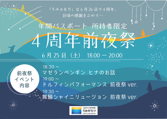 日頃「うみがたり」をご愛顧いただいている年間パスポート所持者の皆さまへ感謝の気持ちを込めて、特別開館を行います。「うみがたり」の開館4周年の前日の夜に前夜祭として、「舞鰯シャイニリュージョン前夜祭ver.」や 「ドルフィンパフォーマンス前夜祭ver.」のほか、「ヒナのおはなし」を先行公開。この日だけの特別イベントを用意しました。1日だけの特別な時間をお過ごしいただけます。
