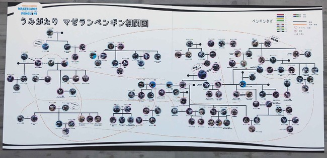 「うみがたり」のマゼランペンギン120羽以上の関係性を記載した巨大な相関図。上越市でペンギン飼育をスタートした時からいるご長寿ペンギンから、ニューフェイスまで複雑な関係性が読み取れるのも、飼育数が日本一である「うみがたり」ならでは!この巨大な相関図を令和4年バージョンにリニューアルします。昨年誕生したなかまたち「ケンペンズ」や新たな関係性を加え、ビッグファミリーや新生カップルなど、相関図を通して「うみがたり」のマゼランペンギンの今が見えてきます。関係性を知ってマゼランペンギンをご覧いただくと、今までよりも更に身近に感じられるかも!?