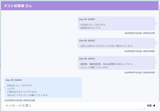 SOKUMEN管理画面の面接詳細画面上で応募者と双方向でコミュニケーションが取れるチャット形式の機能です。