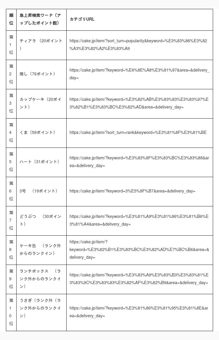 急上昇検索ワードとは、Cake.jp内で検索されたワードの中でも20ポイント以上検索数が増えたワードの中から検索数の多い順にピックアップしたランキングです。