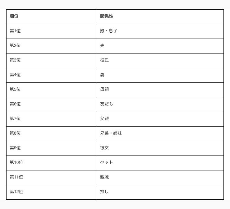 最後にご紹介するのは、Cake.jpで提供している「記念日登録」で登録されているお相手との関係性についてです。記念日の備忘録としてだけではなく、記念日が近づくとお得なクーポンが届くため多くの方が登録しています。一番多かったのは「娘・息子」次いで「夫」「彼氏」と続きます。利用者の7割は女性のためパートナーへのプレゼントに利用している方が多い結果となりました。他にも部下、上司、社長、親戚など意外な方の誕生日や記念日を登録されている方も見受けられました。