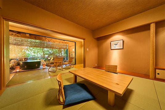 宿自慢の露天風呂は、秘湯気分を味わえる緑に囲まれた森林露天風呂。1,200年以上の歴史を誇る古湯が、冷えた体を芯から温めてくれます。自然あふれる空間で、自分だけの時間に浸れる贅沢なひと時をお過ごしください。また、愛犬と一緒に泊まれるわんちゃん専用客室「プラスわん」など、多彩な部屋タイプをご用意しているので、さまざまなシチュエーションや目的に合わせてご利用いただけます。
