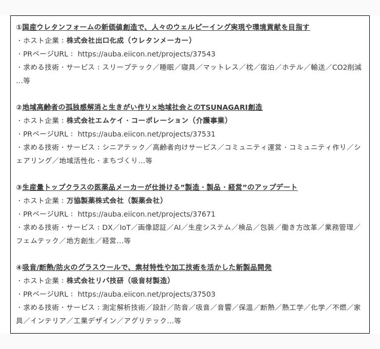 決定した4社は、eiiconの支援の下、本日より、オープンイノベーションプラットフォーム「AUBA」にて共創パートナー企業の募集を開始。コンサルティングや面談サポートなどの伴走支援を行いながら、年度内のマッチング、さらに、オープンイノベーションによる新規事業創出の実現を後押ししてまいります。