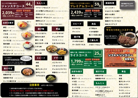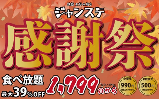 愛知県幸田町の「ジャンステ~鉄板/お好み焼き~(運営:ウッドデザインパーク株式会社)」では、11月1~30日に「ジャンステ感謝祭」と題してサンキュー(39)に結びつけたキャンペーンを開催いたします。