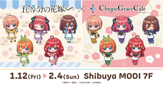 キャラクターグッズの商品企画・製作・販売を行う中外鉱業株式会社コンテンツ部は、「『TVスペシャルアニメ「五等分の花嫁∽」』× Chugai Grace Cafe 」を開催いたします。当イベントは2024年1月12日(金)~2月4日(日)まで渋谷モディ7F Chugai Grace Cafeにて開催となります。