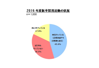 企業に、2016年度の新卒採用活動の状況について聞いた。広報活動やその準備も含めて「現在行っている」と回答した企業が45.6%、「まだ何も行っていない」企業が36.5%という結果になった。一方、3月1日時点で2016年度の新卒採用活動が「既に終了している」と回答した企業は、17.9%に上った。