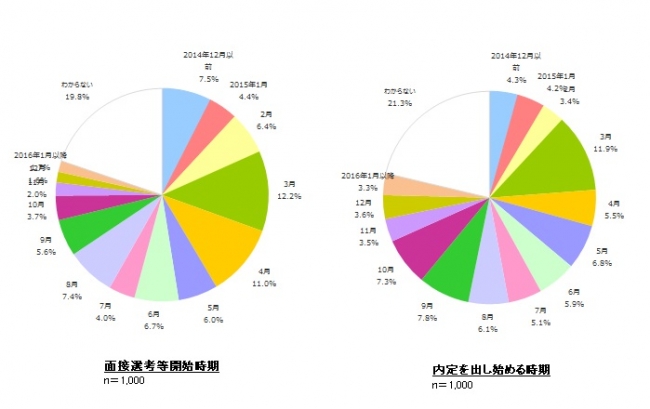 「面接選考開始時期」は、「2015年3月」「2015年4月」が連続して高くなっており、エントリー・応募受付開始早々に選考を開始する企業が多いことがうかがえる。「内定を出し始める時期」は、「2015年3月」と回答した企業が最も多い。その後は減少するも、「2015年8月」「2015年9月」「2015年10月」に再び増加している。