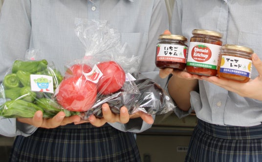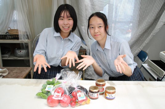 恵那農業高等学校の生徒と農作物や、手作りのジャムやケチャップ