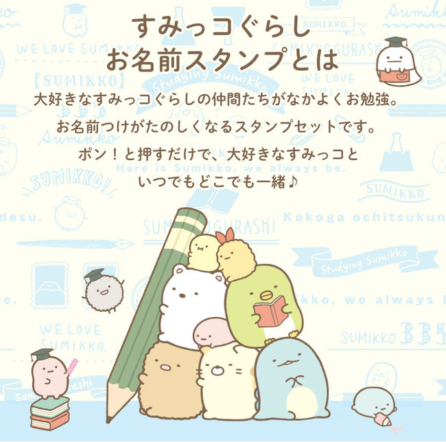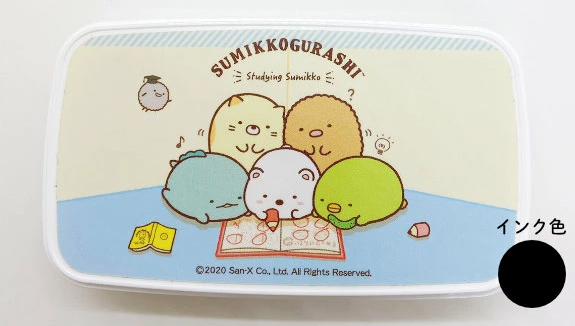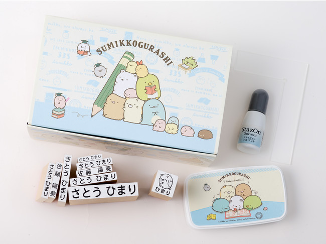 子どものさまざまな持ち物に押せる「すみっコぐらし」のとってもキュートなお名前スタンプセットが登場。収納BOXや専用インクのデザインは、すみっコたちがなかよくお勉強している様子が楽しめます。