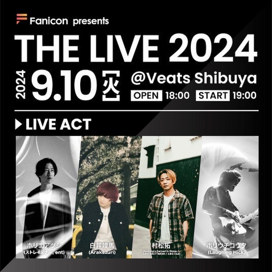 THECOO株式会社(本社:東京都渋谷区、代表取締役CEO:平良真人、証券コード:4255、以下当社)は、2024年9月10日(火)、Veats Shibuyaにてホリエアツシ(ストレイテナー, ent)、白井竣馬 (Arakezuri)、村松拓(Nothing's Carved In Stone / ABSTRACT MASH / とまとくらぶ) 、ホリウチコウタ(Laughing Hick) が出演する一夜限りの弾き語りライブ「Fanicon presents THE LIVE2024 」のチケット一般発売が8月24日10時より開始することをお知らせいたします。
