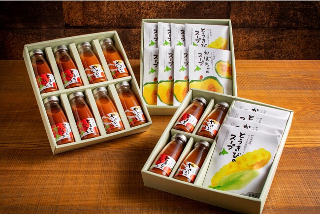 1.スープ&ジュースセット (とうきび&カボチャのスープ、やさい&とまとジュースのセット)