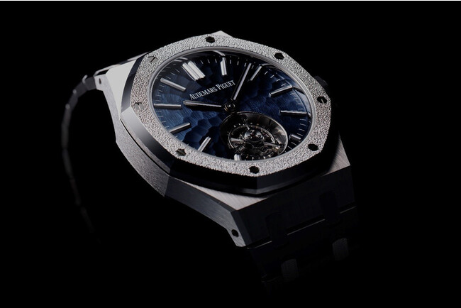 2023年に発表されたディンプルダイヤルを採用した最新作「ロイヤル・オーク」。ベゼルはフロステッド仕上げを施し、複雑機構であるフライング・トゥールビヨンを搭載しています。「ディンプルパターン」を採用したテクスチャーダイヤルは、2019年に発表された「ミレネリー・フロステッドゴールド・フィロソフィーク」が最初であり、今回のモデルで初めてロイヤル・オークにディンプルダイヤルが採用されました。ブランドロゴは、他のロイヤル オークとは異なり、植字ではなく文字盤にプリントされており、ヴィンテージ「ジャンボ」の雰囲気を醸し出しています。