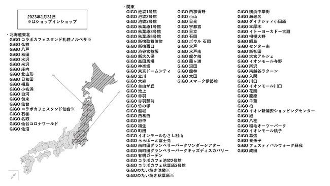 2022年3月9日に『GiGO 池袋1号館』からスタートした新生GiGOは、12月末日時点で186店舗まで拡大いたしました。1月は、東京都、愛知県、大分県、宮崎県において新たに4店舗の「GiGO」が誕生し、1月末に「GiGO」は190店舗になります。