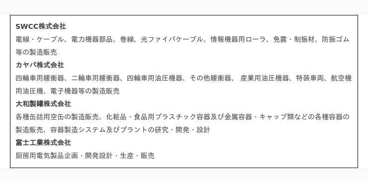 SWCC株式会社 / カヤバ株式会社 / 大和製罐株式会社 / 富士工業株式会社