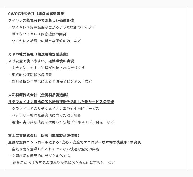 □本プログラム 参画企業4社と募集テーマ、共創イメージ