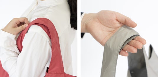 持ち手が太めで、肩に食い込みにくい設計です。肩にかけやすいように、持ち手の部分の太さを場所ごとに変えています。