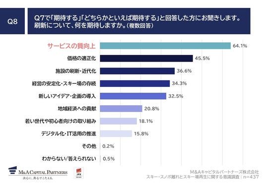 ■老舗スキー場の施設・サービス刷新への期待「サービスの質向上」が64.1%で最多、価格適正化も4割超