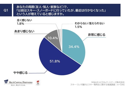 「Q1. あなたの周囲(友人・知人・家族など)で、「以前はスキー・スノーボードに行っていたが、最近は行かなくなった」という人が増えていると感じますか。」(n=546)と質問したところ、「非常に感じる」が34.4%、「やや感じる」が51.8%という回答となりました。