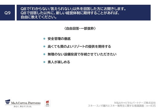 「Q9. Q8で「わからない/答えられない」以外を回答した方にお聞きします。Q8で回答した以外に、新しい経営体制に期待することがあれば、自由に教えてください。」(n=435)と質問したところ、主な回答として「安全管理の徹底」や「高くても質のよいリゾートの提供を期待する」など178件の回答を得ることができました。