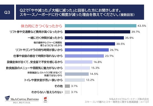 「Q3. Q2で「やや減った」「大幅に減った」と回答した方にお聞きします。スキー・スノーボードに行く頻度が減った理由を教えてください。(複数回答)」(n=131)と質問したところ、「体力的にきつくなったから」が43.5%、「リフト券や交通費など費用が高くなったから」が39.7%、「一緒に行く仲間が減ったから」が35.9%という回答となりました。