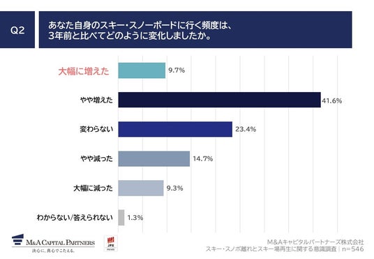 「Q2. あなた自身のスキー・スノーボードに行く頻度は、3年前と比べてどのように変化しましたか。」(n=546)と質問したところ、「大幅に増えた」が9.7%、「やや増えた」が41.6%という回答となりました。