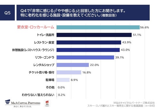 さらに、スキー場施設の老朽化については「非常に感じる」(24.9%)「やや感じる」(55.7%)と、8割超が施設の古さを感じています。特に老朽化を感じる施設は「更衣室・ロッカールーム」が56.6%で最多、次いで「トイレ・洗面所」51.1%と、水回り設備への不満も顕著でした。また、スキー場に行く頻度が減った理由では、「体力的にきつくなったから」 43.5%が最多となっています。