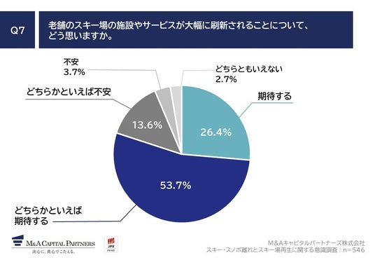「Q7. 老舗のスキー場の施設やサービスが大幅に刷新されることについて、どう思いますか。」(n=546)と質問したところ、「期待する」が26.4%、「どちらかといえば期待する」が53.7%という回答となりました。