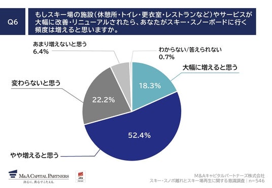「Q6. もしスキー場の施設(休憩所・トイレ・更衣室・レストランなど)やサービスが大幅に改善・リニューアルされたら、あなたがスキー・スノーボードに行く頻度は増えると思いますか。」(n=546)と質問したところ、「大幅に増えると思う」が18.3%、「やや増えると思う」が52.4%という回答となりました。