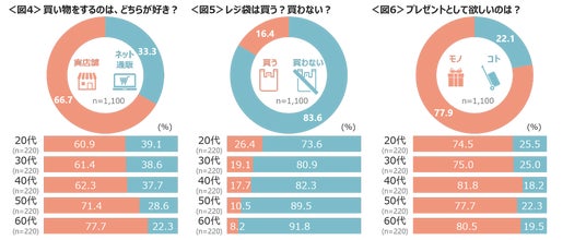 - 買い物は、「実店舗」の方が好きが66.7%。年代が上がるほど「実店舗」の方が好きな割合が増える。